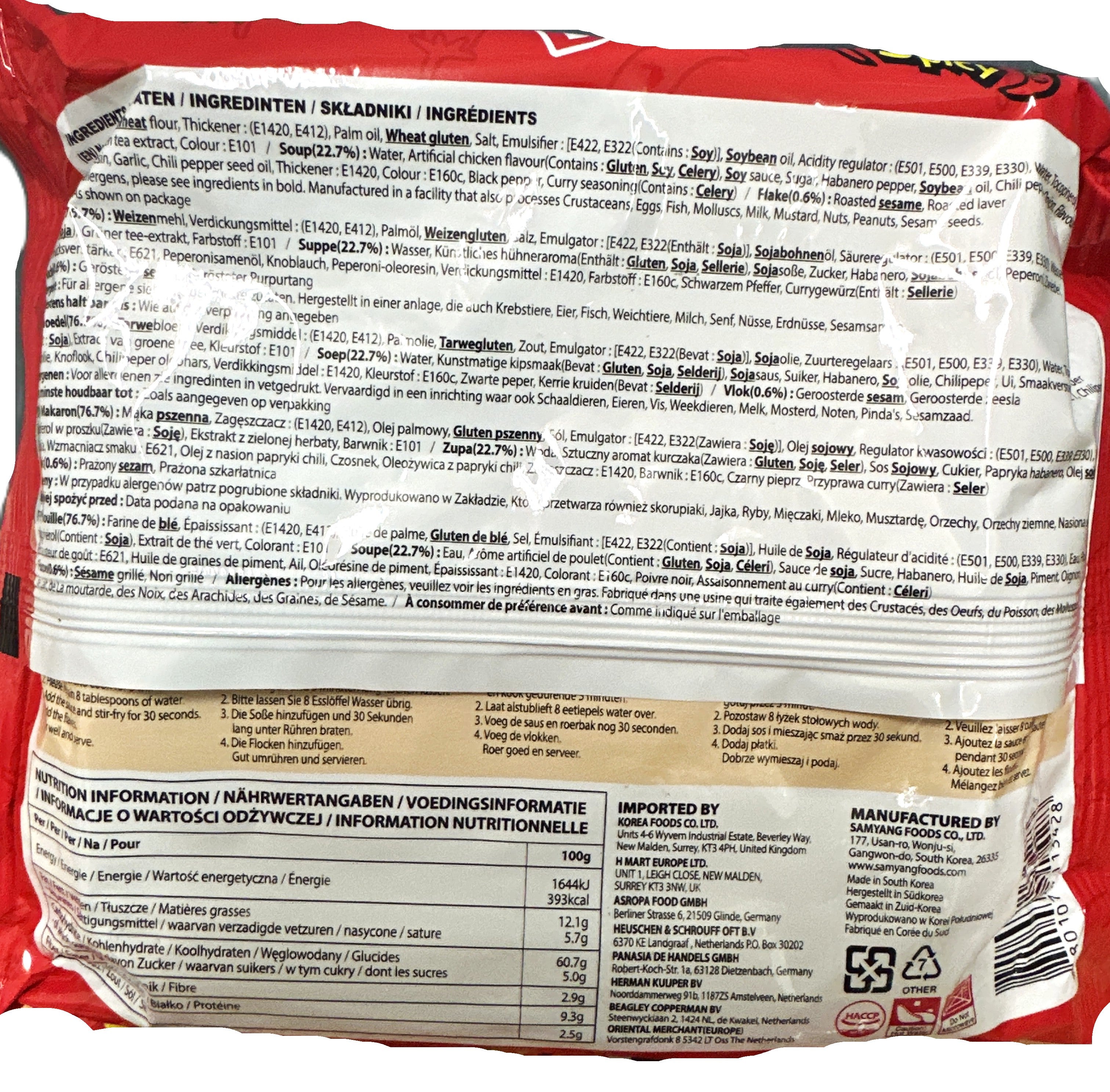 Zutaten: Nudeln (76,7 %): Weizenmehl, Verdickungsmittel : (E1420) Palmöl, Weizengluten, essbares Speisesalz, Emulgator : ( E422, E322 (Enthält : Soja), Sojabohnenöl, Säureregulator [Kaliumcarbonat (E501), Natriumcarbonat (E500), Dibasisches Natriumphosphat (E339), Verdickungsmittel Guarkernmehl (E412), Grüntee-Aromaöl, Riboflavin (E101), Zitronensäure (E330), Suppe (22,7%), Wasser, Zucker, Geschmacksverstärker Mononatrium-L-Glutamat (E621), Sojasauce (Weizen), Sojabohnenöl, künstliches Hühneraroma-Pulver (Gluten, Soja, Sellerie), habanero, Peperoni, Zwiebeln, essbares Speisesalz, Knoblauch, schwarzer Pfefferpulver, Currygewürz (Enthält : Sellerie), Flocke(0,6%) : Gerösteter Sesam, Gerösteter Purpurtang.